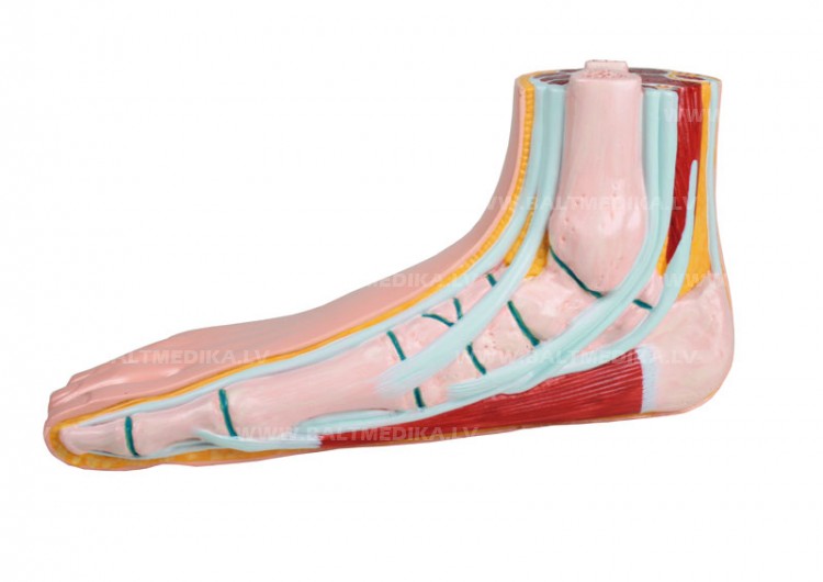Pieauguša cilvēka plakanās pēdas šķērsgriezums. Uzskatāmi attēloti kauli, locītavas, saites, taukaudi un muskuļi.