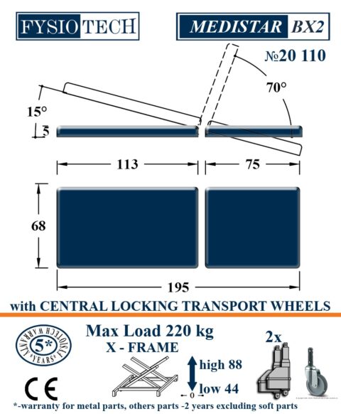 Medistar BX2 ir elektrisks izmeklēšanas galds ar divu sekciju dizainu un regulējamiem leņķiem, kas nodrošina daudzpusīgu pacienta pozicionēšanu. Tas ir aprīkots ar dažādām komfortu uzlabojošām funkcijām, lai atbalstītu vispārējās izmeklēšanas. Galdam ir arī Trendelenburga pozicionēšanas funkcija, ko atbalsta gāzes atsperu mehānismi, lai nodrošinātu papildu elastību. Drošības un lietošanas ērtībai ārstēšanas galds ir aprīkots ar centrālo bremžu sistēmu un antistatisku grozāmu ritentiņu. Turklāt pēc īpaša pieprasījuma var tikt nodrošināti pielāgoti izmēri.
